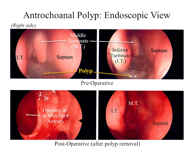 So a polyp arising from the maxillary sinus antrum and extending far to the back of the nose into the choana is called an antral-choanal polyp, and for some reason the term contracts further to form antrochoanal (which might be a job-security issue for linguists who contrive this stuff).